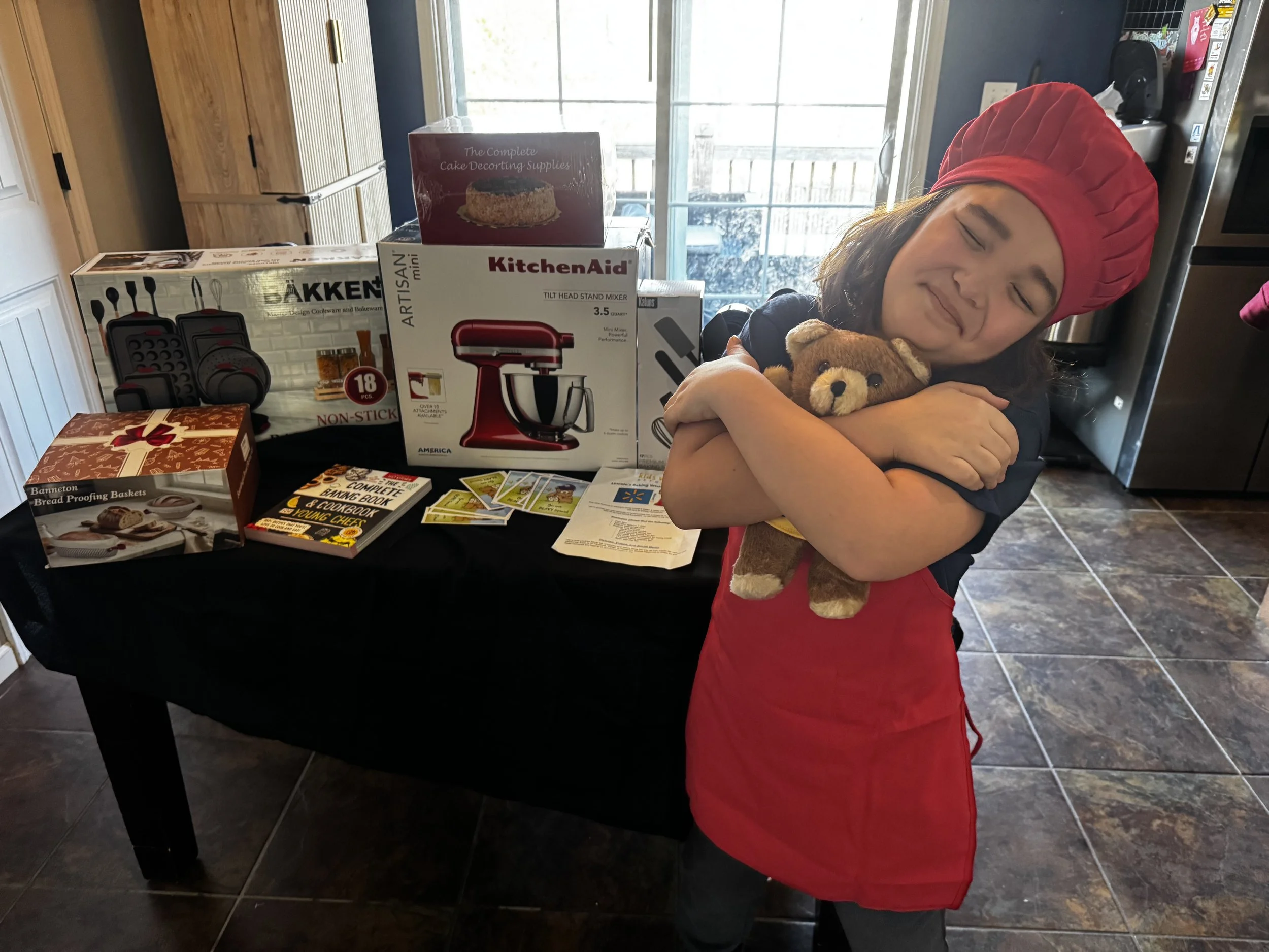 One by one, Donald unwrapped each gift and lit up in awe: a cake decorating kit, an assortment of spatulas, a full bakeware set, a sourdough bread baking kit, an apron and chef’s hat, and a gorgeous KitchenAid mixer. It was even red, his favorite color. “Oh he’s so happy!” said his mom Leslie, after Donald ran over and hugged her, overflowing with joy. “Momma doesn’t even have a KitchenAid mixer,” she joked. “This is the cream of the crop when it comes to mixers, it’s beautiful!”
