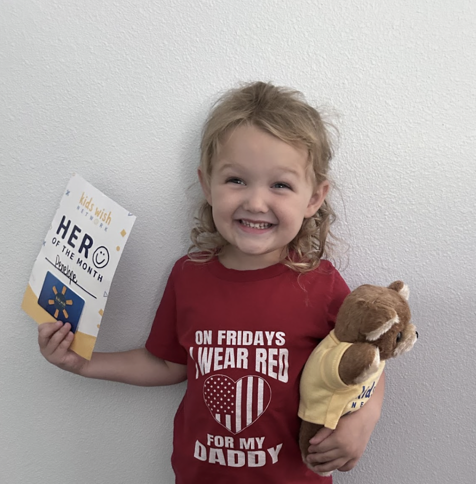 Penelope received a Hero gift package as part of Kids Wish Network’s Hero of the Month program. She has a military parent who is currently deployed, and Kids Wish Network is grateful to honor her family for their service and sacrifices.
